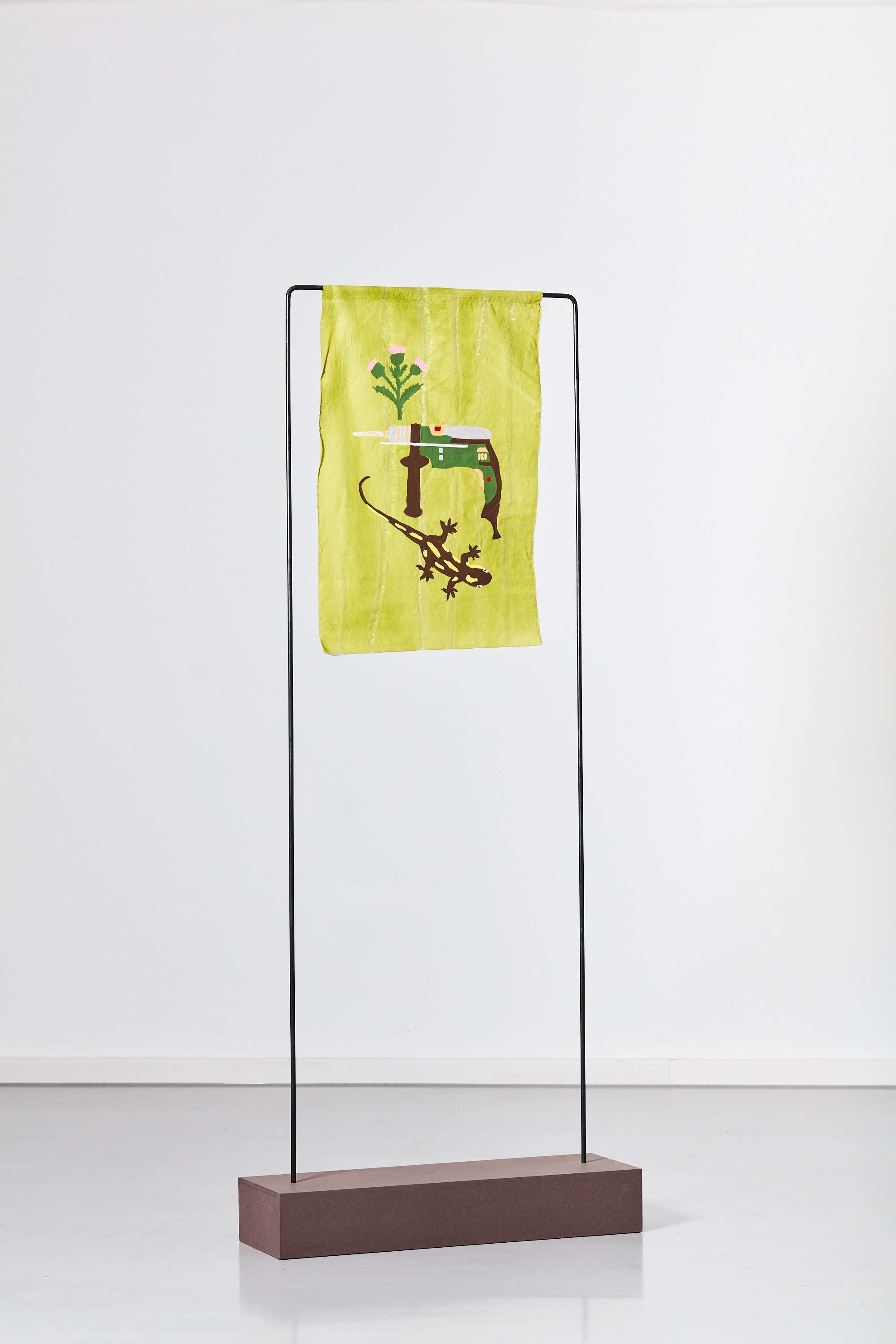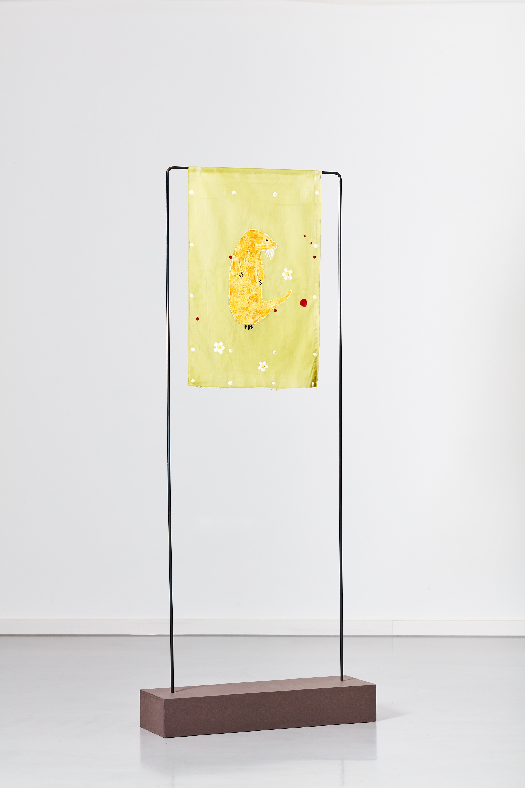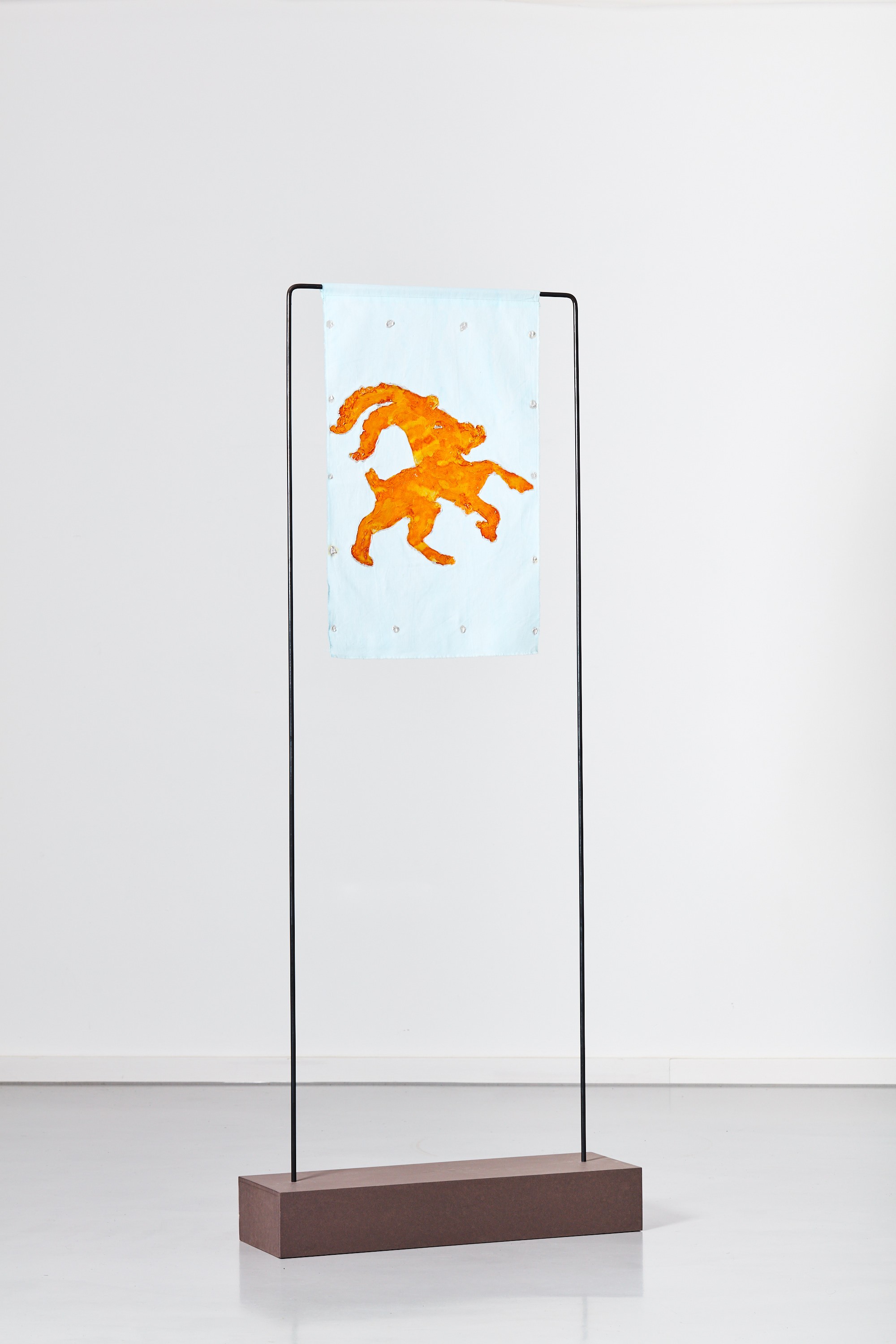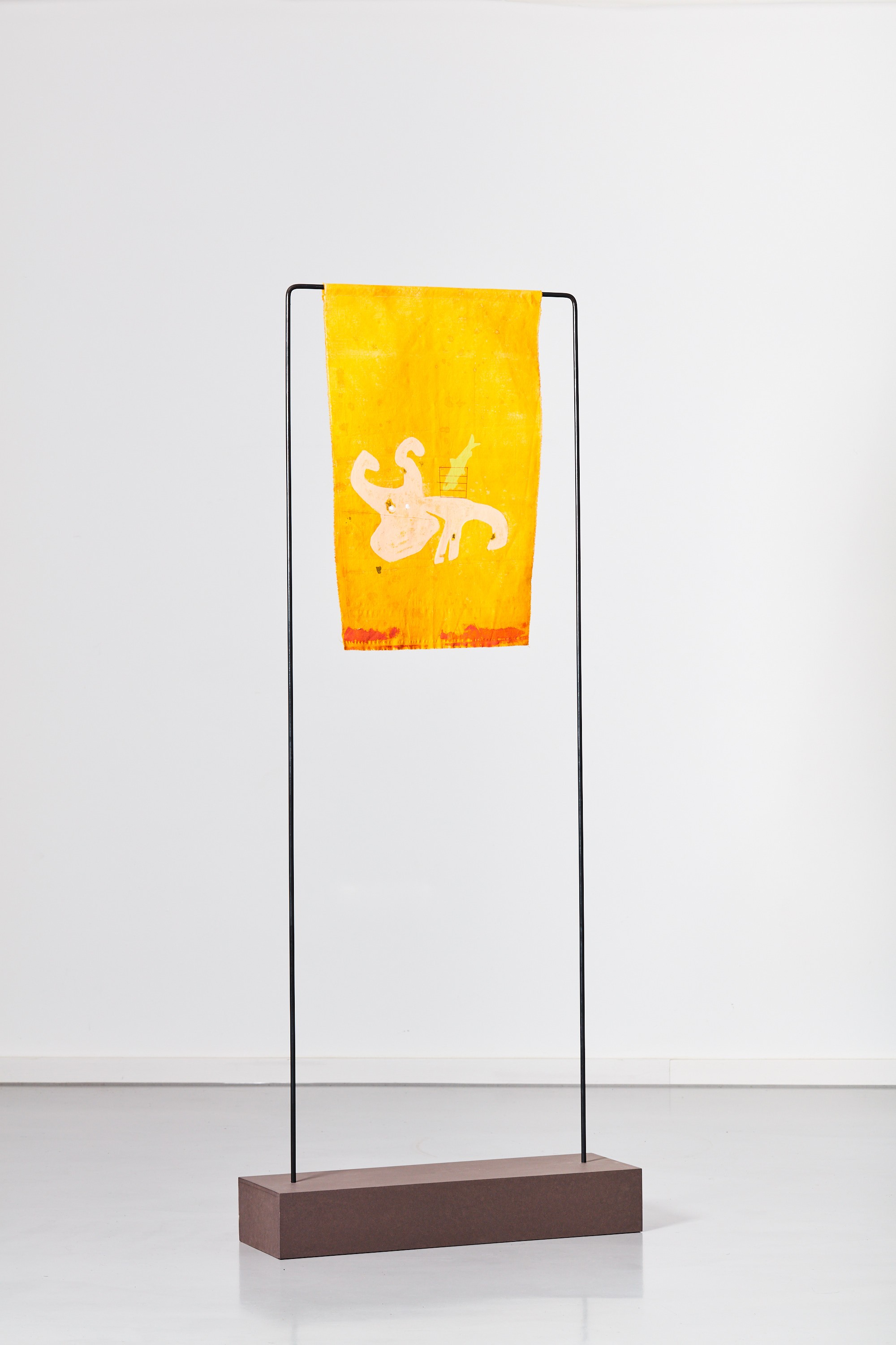 china ink on cotton, flag: 41x62cm, flag stand: 11x21x65cm, 54x160cm
