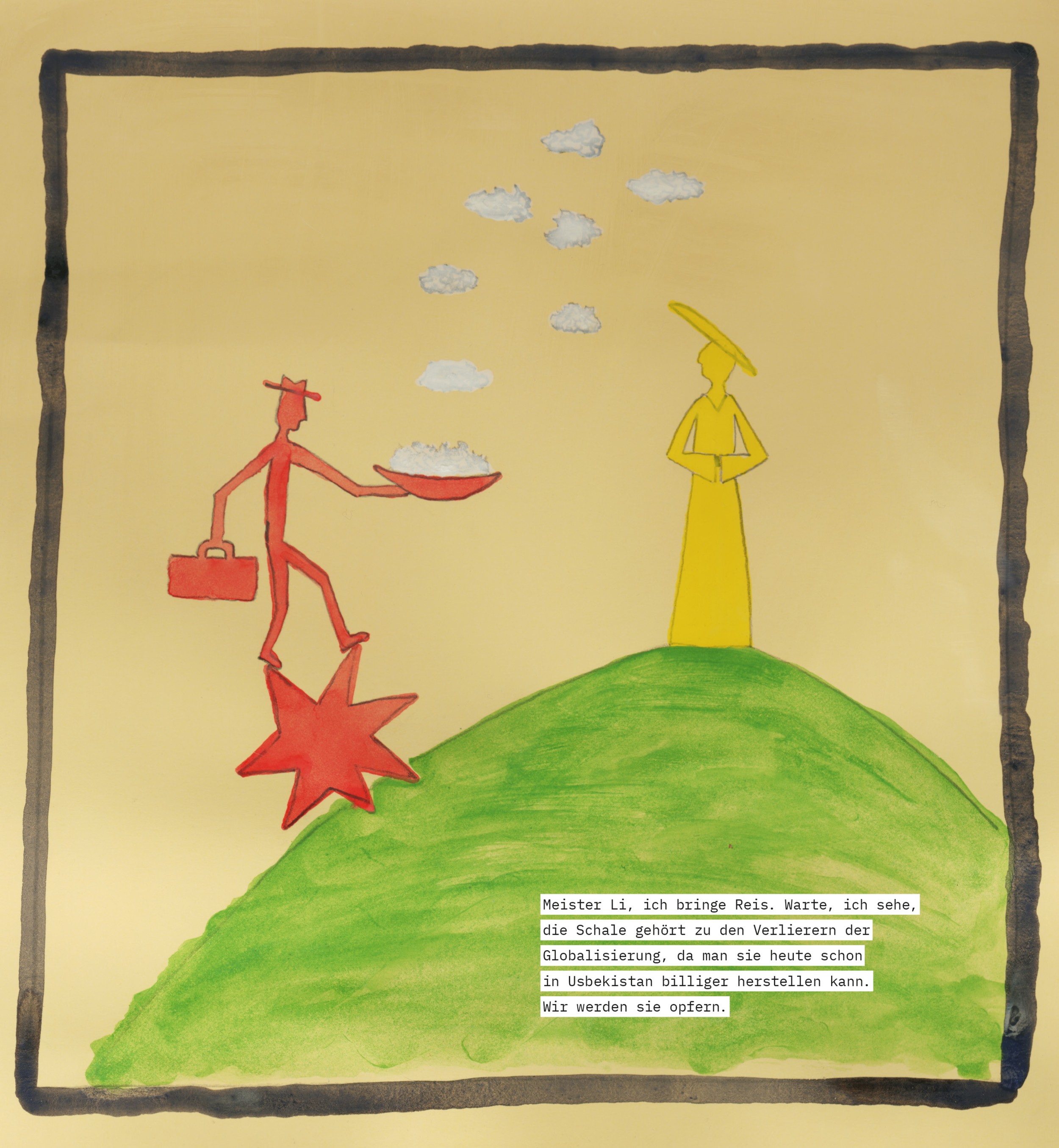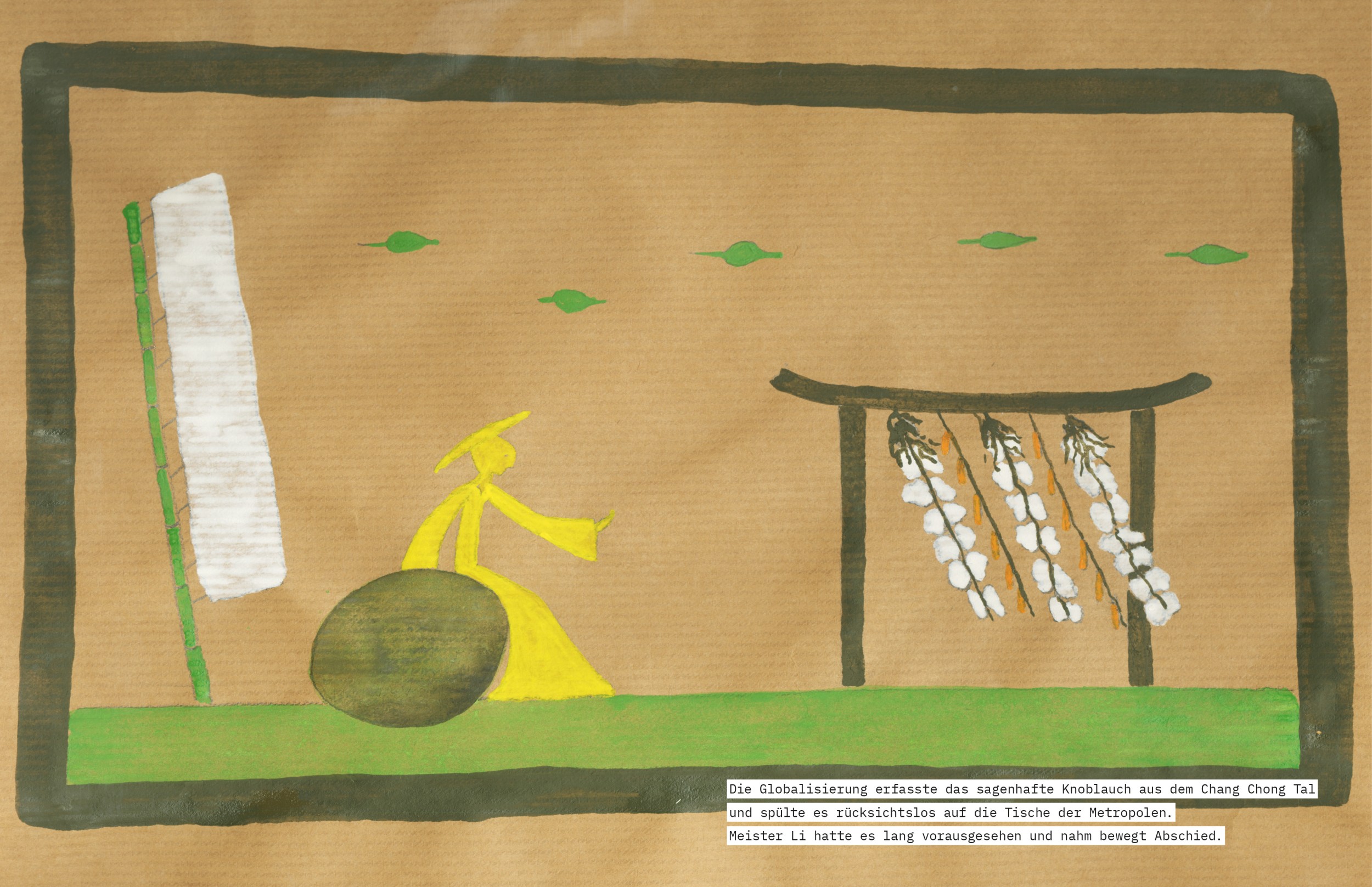 Die Globalisierung erfasste das sagenhafte Knoblauch aus dem Chang Chong Tal und spülte es rücksichtslos auf die Tische der Metropolen. Meister Li hatte es lang vorausgesehen und nahm bewegt Abschied.